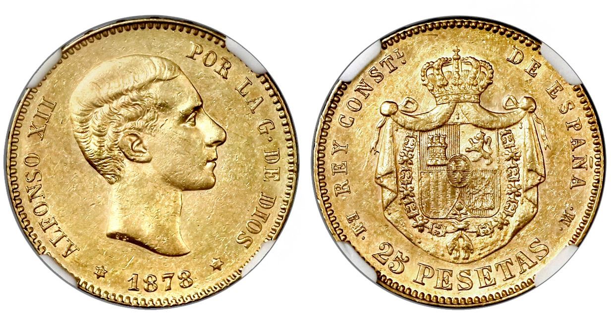 Madrid, Spain, 25 pesetas, Alfonso XII, 1878EM-M, with 18-78 inside six-point stars, NGC AU 55.