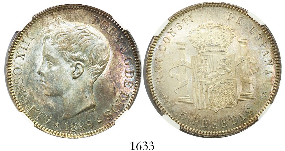 Madrid, Spain, 5 pesetas, Alfonso XIII, 1899-SGV, 99 inside stars, encapsulated NGC MS 64, tied for second finest known in NGC census. KM-707 Beautifully rainbow toned over lustrous surfaces, lots of green and magenta color, practically top grade except for long mark across center of reverse.
