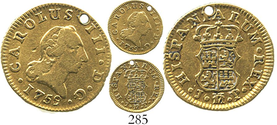 Madrid, Spain, bust 1/2 escudo, Charles III, 1759JP. CT-258; KM-378. 1.7 grams. VF with small hole at top, nice strike, sediment around details.