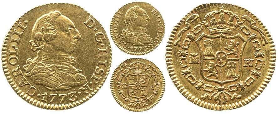 Madrid, Spain, bust 1/2 escudo, Charles III, 1773PJ. KM-415.1; CT-767. 1.8 grams. Slightly off-center AU, nice bold strike.