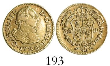 Madrid, Spain, bust 1/2 escudo, Charles III, 1783/74JD/PJ, rare. CT-775; KM-unl. (cf. 415.1). 1.71 grams. Problem-free XF, interesting overdate-overassayer combination.