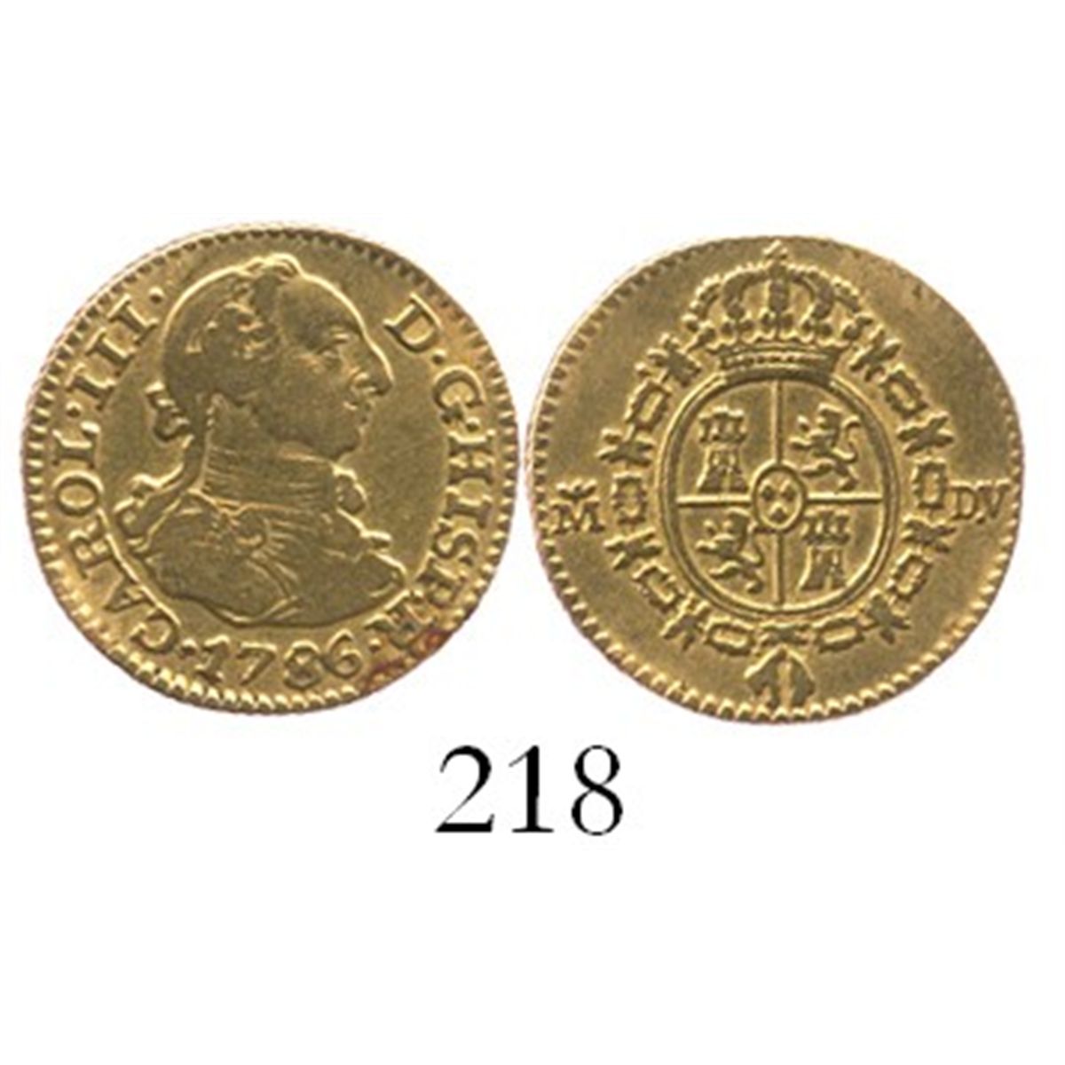 Madrid, Spain, bust 1/2 escudo, Charles III, 1786DV. CT-778; KM-425.1. 1.7 grams. Nice VF, spot of red on obverse rim.