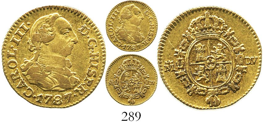 Madrid, Spain, bust 1/2 escudo, Charles III, 1787DV. CT-779; KM-425.1. 1.7 grams. XF with faint old scratch on bust, contrasting sediment around details on reverse.