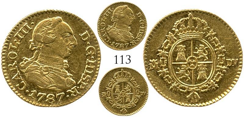 Madrid, Spain, bust 1/2 escudo, Charles III, 1787DV. CT-779; KM-425.1. 1.8 grams. Lustrous XF-AU, no problems.