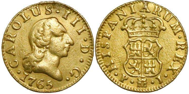 Madrid, Spain, bust 1/2 escudo, Charles III (young bust), 1765PJ. CT-759; KM-389.1. 1.70 grams. Bold AXF with slightly smoothed edge all around.