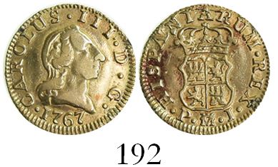 Madrid, Spain, bust 1/2 escudo, Charles III (young bust), 1767PJ. CT-761; KM-389.1. 1.76 grams. Lustrous AU- with light adjustment marks on reverse, spots of red toning, minor flan-bulging.