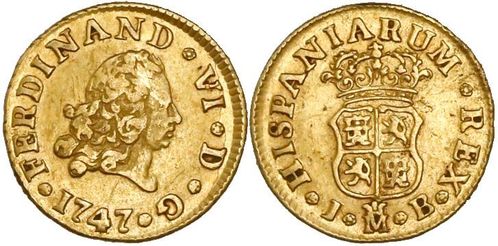 Madrid, Spain, bust 1/2 escudo, Ferdinand VI, 1747JB. CT-242; KM-372. 1.74 grams. VF, no problems.