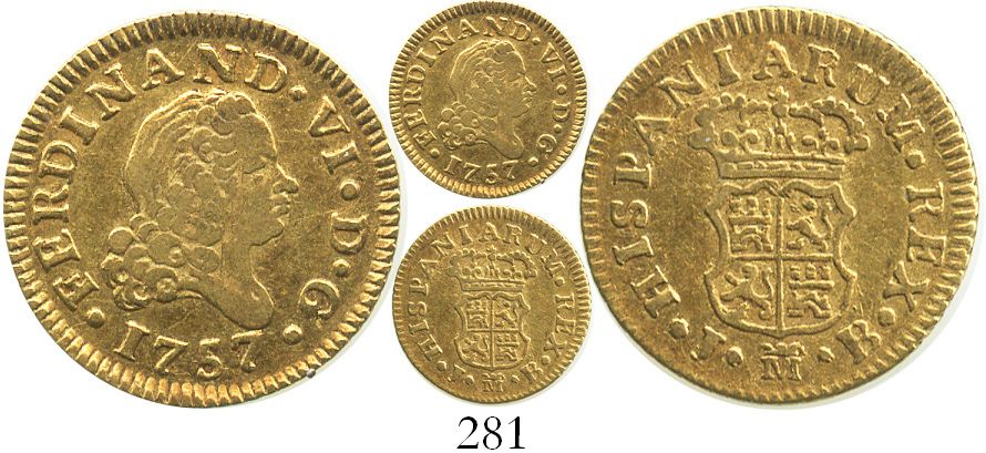 Madrid, Spain, bust 1/2 escudo, Ferdinand VI, 1757JB. CT-255, KM-378. 1.8 grams. Attractively red-toned XF on a broad flan, no problems.