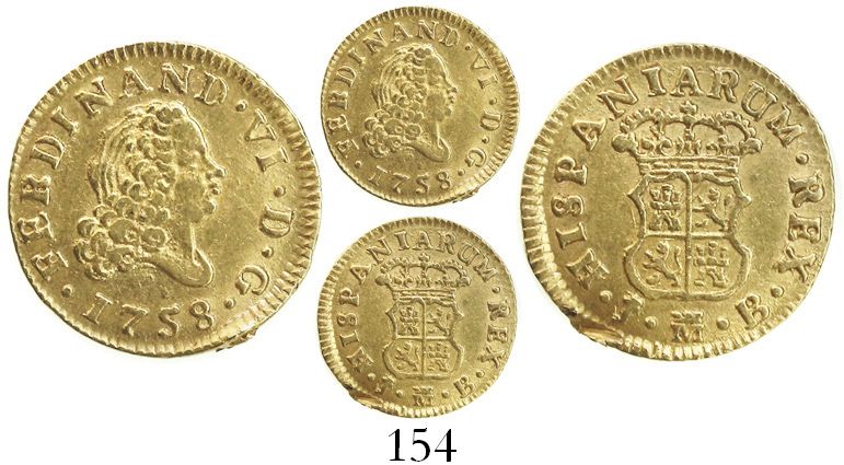 Madrid, Spain, bust 1/2 escudo, Ferdinand VI, 1758JB. CT-256; KM-378. 1.75 grams. Nice AU with muted luster, rim-gouge below shield.