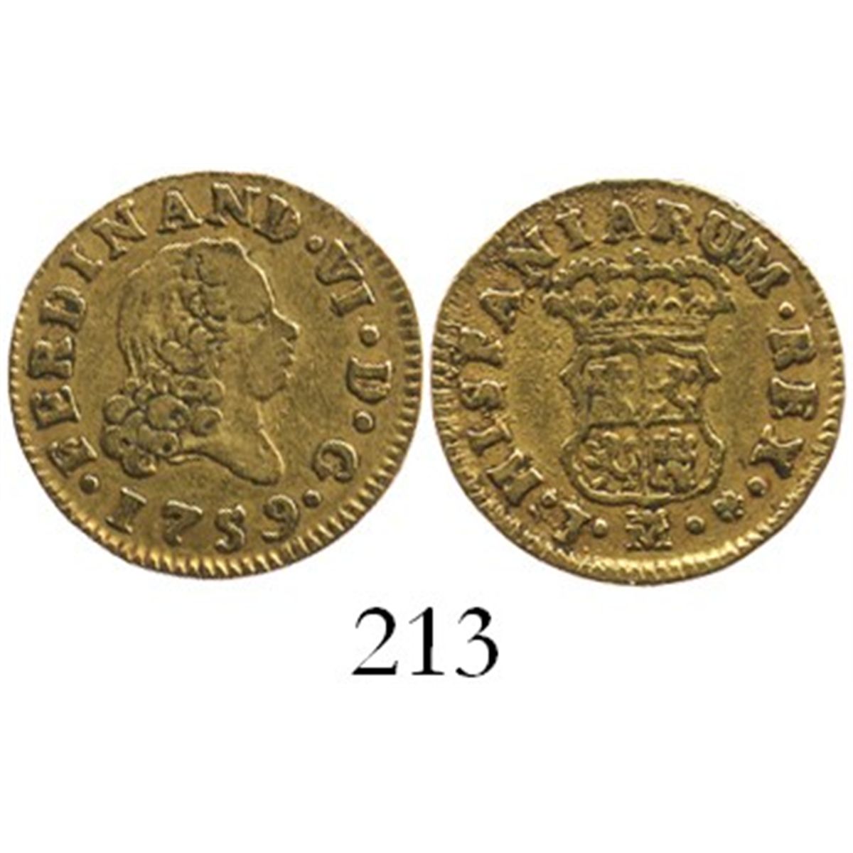 Madrid, Spain, bust 1/2 escudo, Ferdinand VI, 1759J. CT-258; KM-378. 1.8 grams. Problem-free VF.