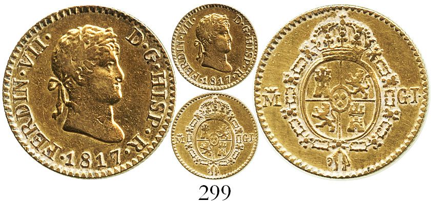 Madrid, Spain, bust 1/2 escudo, Ferdinand VII, 1817GJ. CT-360; KM-492. 1.8 grams. Bold XF, no problems, one-year type.