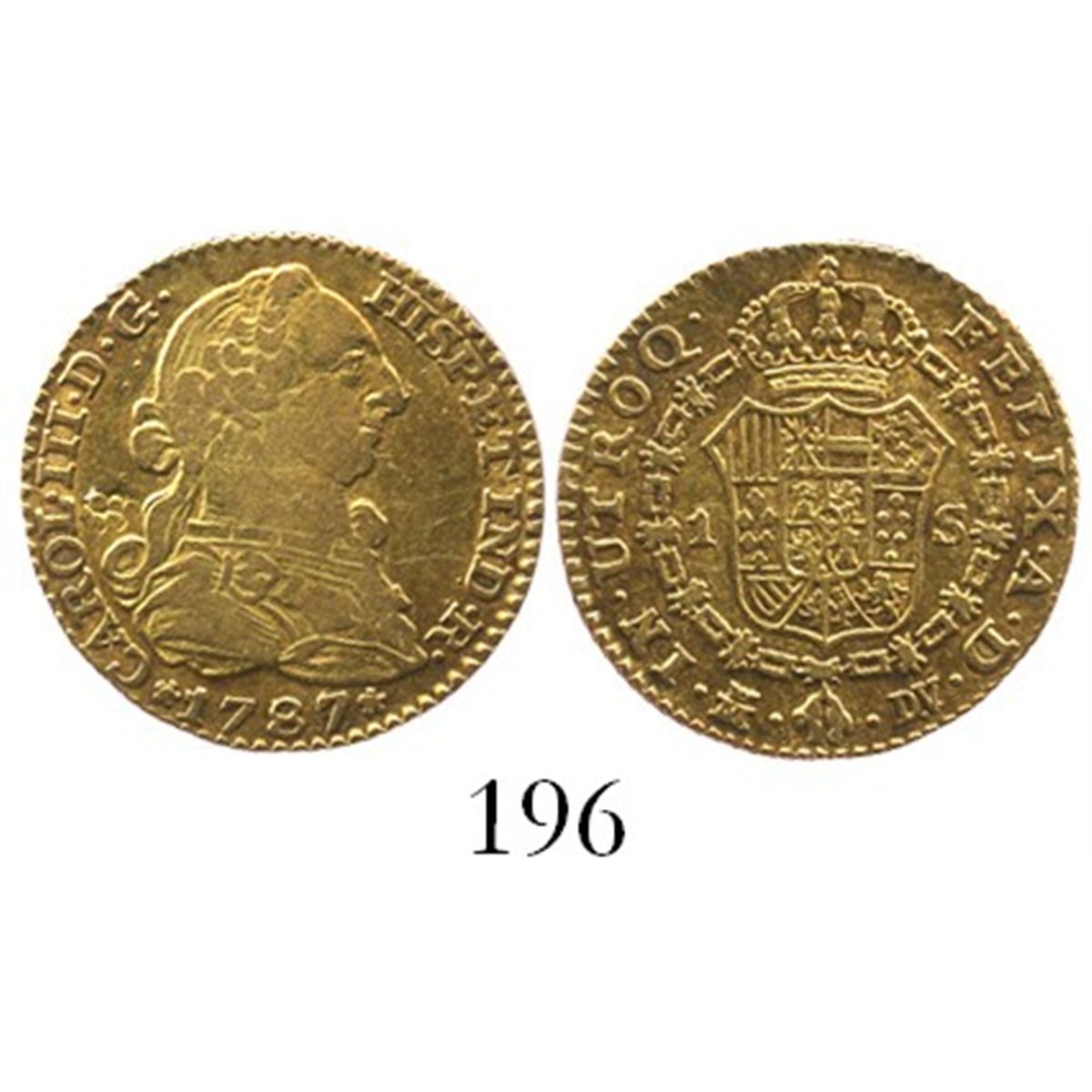 Madrid, Spain, bust 1 escudo, Charles II, 1787DV. CT-629; KM-416.1a. 3.3 grams. Decent AXF with nice toning.
