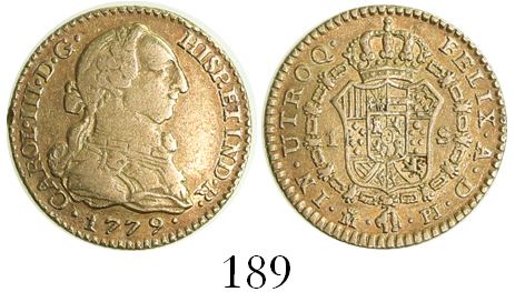 Madrid, Spain, bust 1 escudo, Charles III, 1779PJ. CT-621; KM-416.1. 3.34 grams. XF with hint of luster and toning, minor rim-ding.