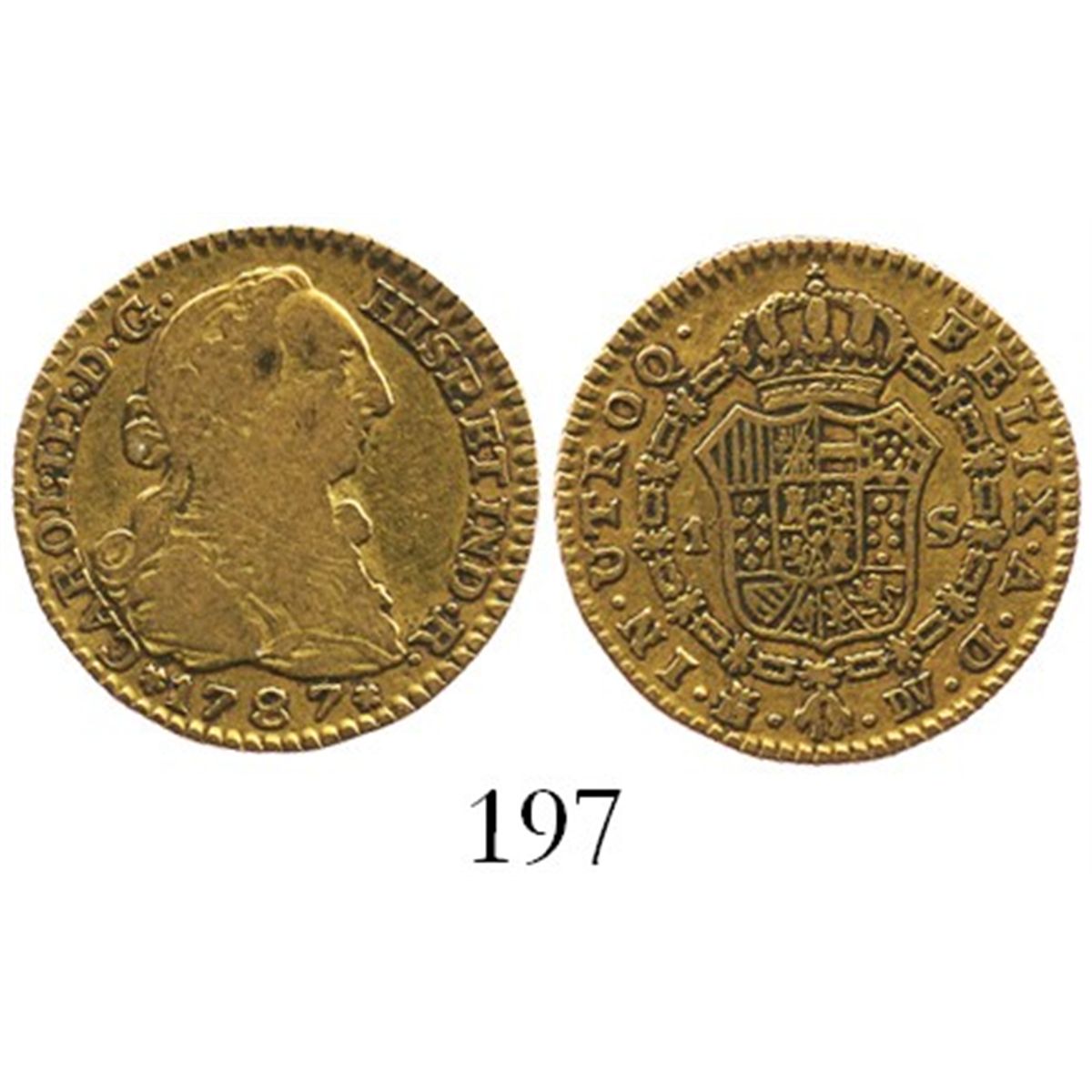 Madrid, Spain, bust 1 escudo, Charles III, 1787DV. CT-629; KM-416.1a. 3.3 grams. Problem-free AVF with dark sediment around details.