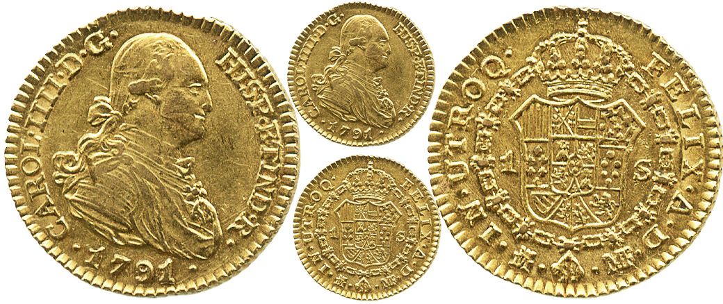 Madrid, Spain, bust 1 escudo, Charles IV, 1791MF. KM-434; CT-490. 3.3 grams. Lustrous UNC with faint hairlines on obverse.