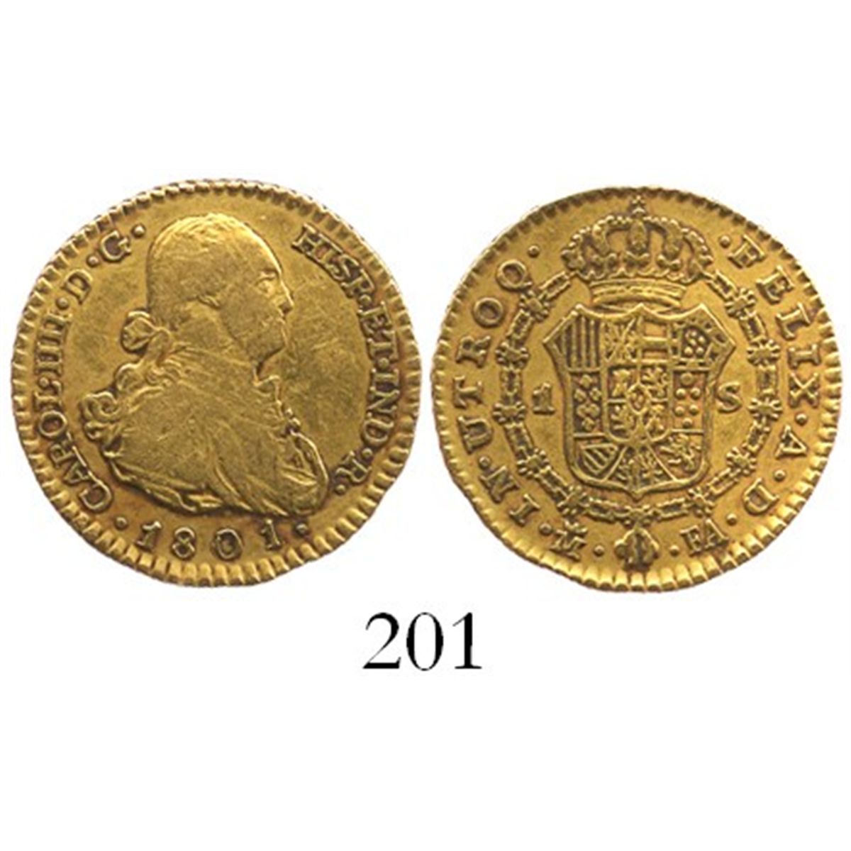 Madrid, Spain, bust 1 escudo, Charles IV, 1801FA. CT-500; KM-434. 3.1 grams. VF+ with nicely contrasting sediment around details, no problems.