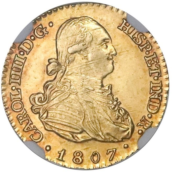 Madrid, Spain, bust 1 escudo, Charles IV, 1807FA, NGC MS 63. Cal-1120; KM-434. Excellent luster with light red toning, very bold details including a well-detailed bust showing only faint adjustment marks, scarce final date of type, tied with two others for second finest in NGC census behind a single MS 64. NGC #2801277-014.