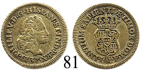 Madrid, Spain, bust 1 escudo, Philip V, 1737JF. KM-342. 3.3 grams. Broad-flan VF+ with dark toning around details, brassy color, no problems, scarce early issue.