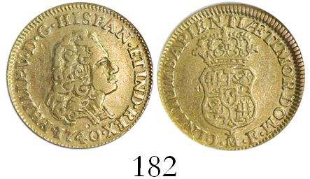 Madrid, Spain, bust 1 escudo, Philip V, 1740JF, encapsulated NGC VF 30. CT-491; KM-342. More like XF with slight central weakness, clean fields, slightly off-center reverse, scarce early type.