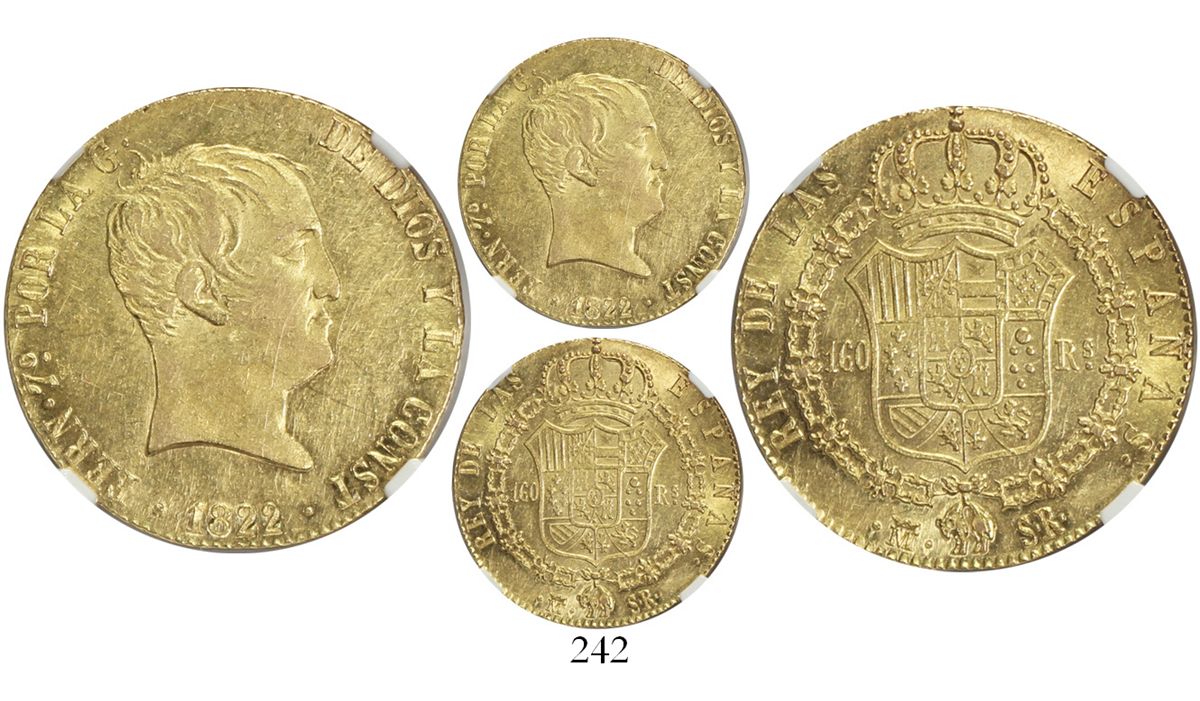 Madrid, Spain, bust 160 reales de vellon, Ferdinand VII, 1822SR, encapsulated NGC AU 58. KM-565; CT-153. Brilliant luster all over, with faint surface hairlines, wear in hair, scarce one-year type.
