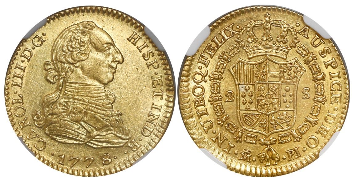 Madrid, Spain, bust 2 escudos, Charles III, 1778PJ, encapsulated NGC AU 58. CT-451; KM-417.1. Lustrous and choice, with bagmarks only on obverse (AU-/UNC).