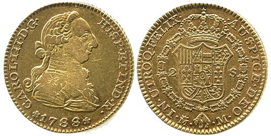 Madrid, Spain, bust 2 escudos, Charles III, 1788M. KM-435.1; CT-459. 6.8 grams. Problem-free XF with hint of toning in legends.