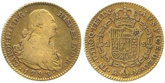 Madrid, Spain, bust 2 escudos, Charles IV, 1793MF. KM-435.1; CT-326. 6.6 grams. Problem-free VF with contrasting sediment around details.