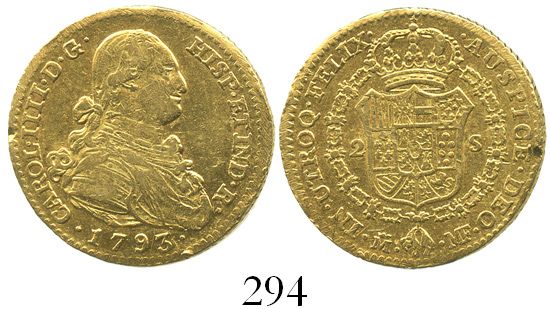 Madrid, Spain, bust 2 escudos, Charles IV, 1793MF. CT-326; KM-435.1. 6.6 grams. Lustrous AU- with crude rims all around (mostly as made but at least one rim-nick too).