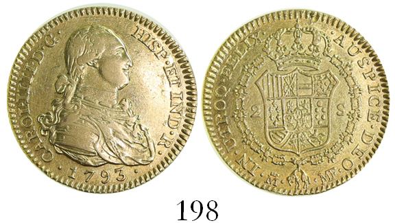 Madrid, Spain, bust 2 escudos, Charles IV, 1793MF. CT-326; KM-435.1. 6.73 grams. Lightly polished AU with small lamination on part of reverse rim.