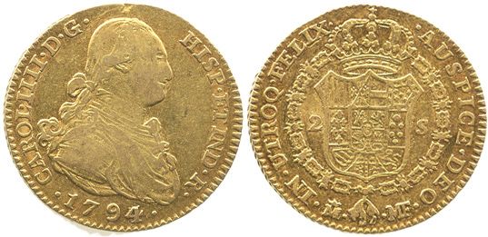 Madrid, Spain, bust 2 escudos, Charles IV, 1794MF.
