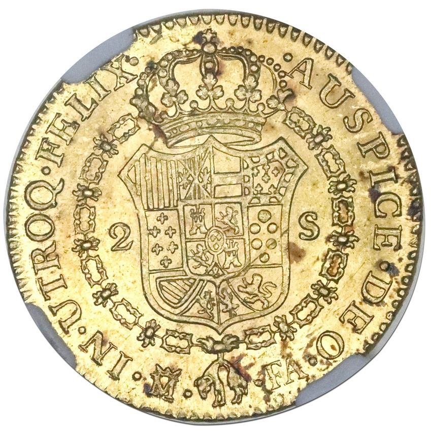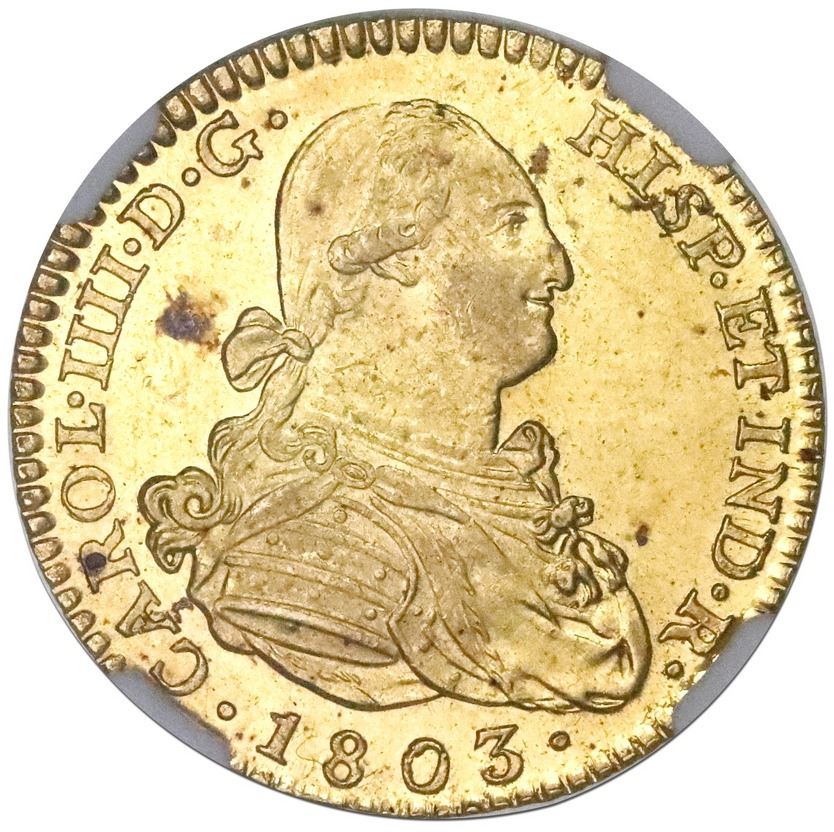 Madrid, Spain, bust 2 escudos, Charles IV, 1803FA, NGC MS 63, "top pop." Cal-1308; KM-435.1. Superb strike and luster, virtually no marks or wear but a few small carbon spots, tied with three others for finest in NGC census. NGC #2060264-010.