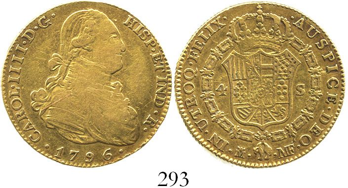 Madrid, Spain, bust 4 escudos, Charles IV, 1796MF. CT-205; KM-436.1. 13.4 grams. XF with slightly weak bust, old scratches on neck, hint of toning and luster.