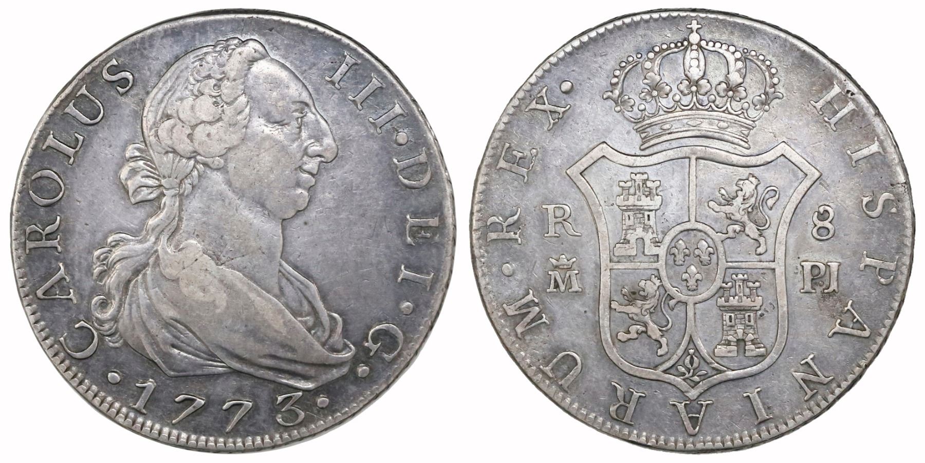 Madrid, Spain, bust 8 reales, Charles III, 1773PJ.