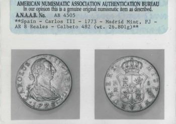 Madrid, Spain, bust 8 reales, Charles III, 1773PJ. CT-877; KM-414.1. 26.82 grams. VF/XF with muted luster but some surface hairlines, rims a bit weak, gray toning all over with lighter gold shades at high points. With ANAAB (photo-certificate) #AB4505.