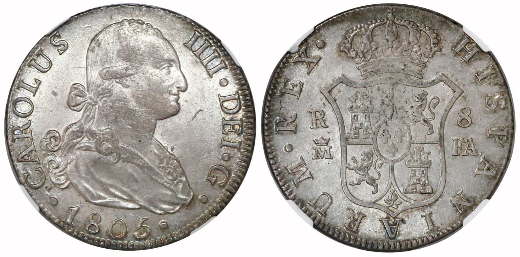Madrid, Spain, bust 8 reales, Charles IV, 1805M, NGC AU 58. CT-675; KM-432.1 . Light wear across bust and shield, weakly struck centers plus horizontal adjustment marks across bust, plenty of luster in fields with some rainbow toning around date and letters. NGC #3834230-001.