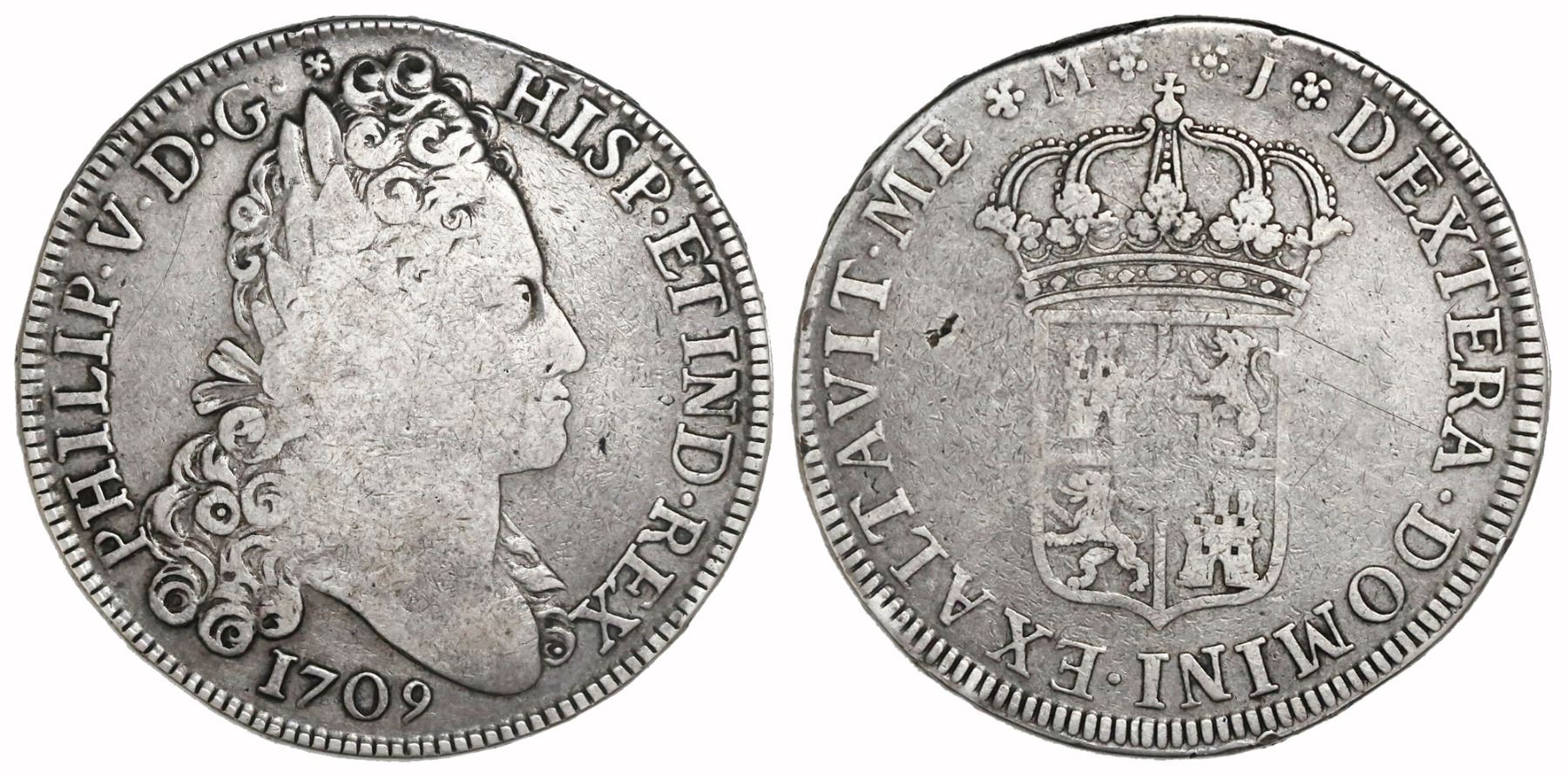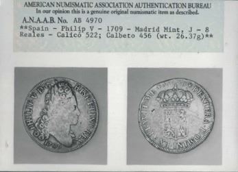 Madrid, Spain, bust 8 reales, Philip V, 1709J, medal alignment. CT-677; KM-281. 26.38 grams. AVF with weak centers and portion of rim but legends still bold, a few minor surface marks, scarce one-year issue. With ANAAB photo-certificate #AB4970.