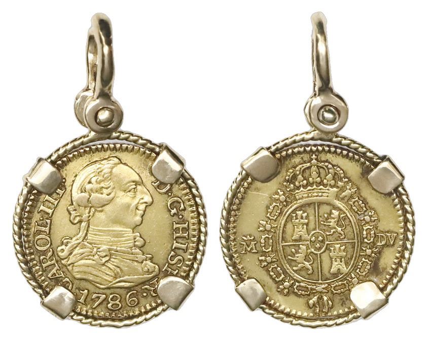 Madrid, Spain, bust gold 1/2 escudo, Charles III, 1786DV, mounted in twisted-wire 18K gold bezel with shackle bail. 2.86 grams total. Bold XF coin in a dainty mount with broad prongs and oversized bail for large chain. With photo-certificate.