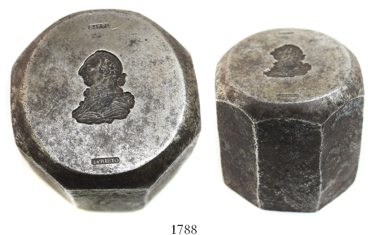 Madrid, Spain, die for bust of Charles III for 4 escudos, dated 1770, by die-sinker T. Prieto, rare. 1440 grams, 2-1/2" in diameter and 2-1/4" tall. Excellent condition, with minor rust on outside only, typically 8-sided hub with design in center of smooth end, with Madrid mintmark and date 1770 in cartouche at top and die-sinker's name in cartouche at bottom.