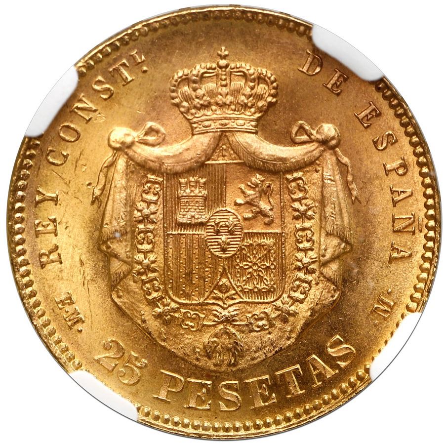 Madrid, Spain, gold 25 pesetas, Alfonso XII, 1879(79) EM-M, NGC MS 66. Cal-74; KM-673. Strongly lustrous and rich in color, also perfectly struck, with practically pristine surfaces, currently tied with two others for second finest in the NGC census behind a single MS 67.