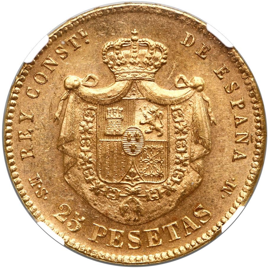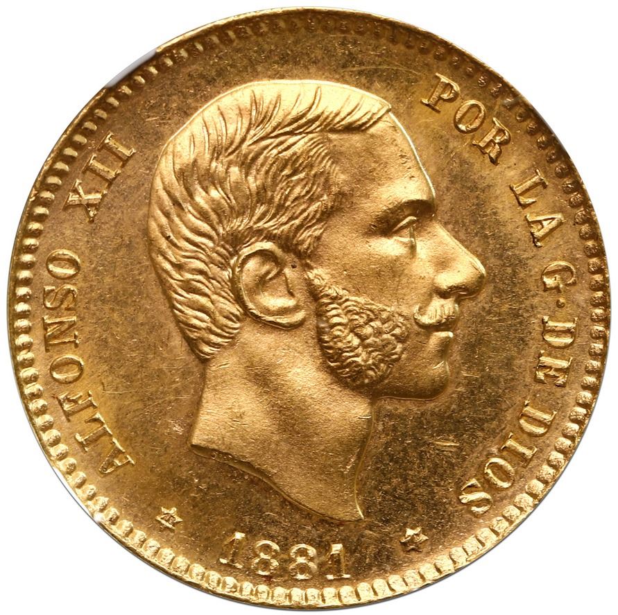 Madrid, Spain, gold 25 pesetas, Alfonso XII, 1881(81) MS-M, bust with beard, NGC MS 65.