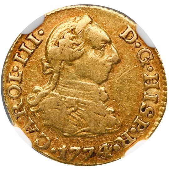 Madrid, Spain, gold bust 1/2 escudo, Charles III, 1774/3 PJ, NGC XF 40.