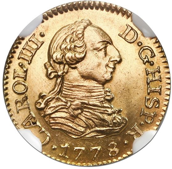 Madrid, Spain, gold bust 1/2 escudo, Charles III, 1778 PJ, NGC MS 64. Cal-1267; KM-415.1. Perfect strike and surfaces, without even a trace of marks or wear, one of three at this second highest grade in the NGC census.