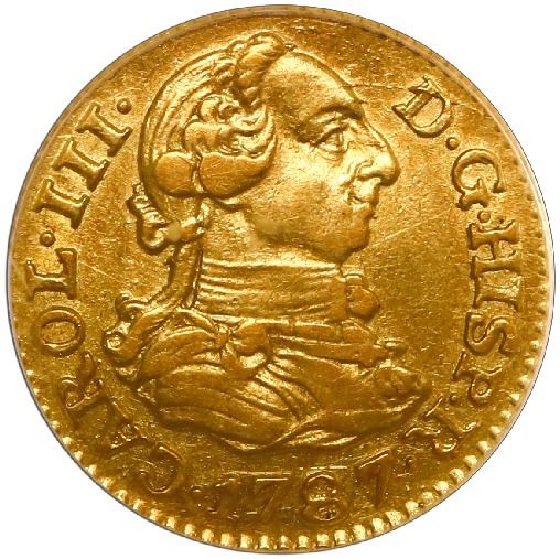 Madrid, Spain, gold bust 1/2 escudo, Charles III, 1787 DV, PCGS AU58. Cal-1281; KM-425.1; Fr-278. Nice reverse with satin-smooth fields, high points on obverse a little flat and with some wear, muted luster all over.