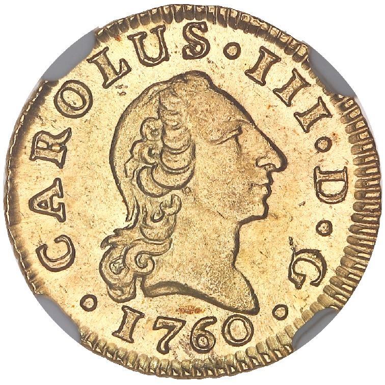 Madrid, Spain, gold bust 1/2 escudo, Charles III (young bust), 1760JP, plain crown, NGC MS 65 ("top
