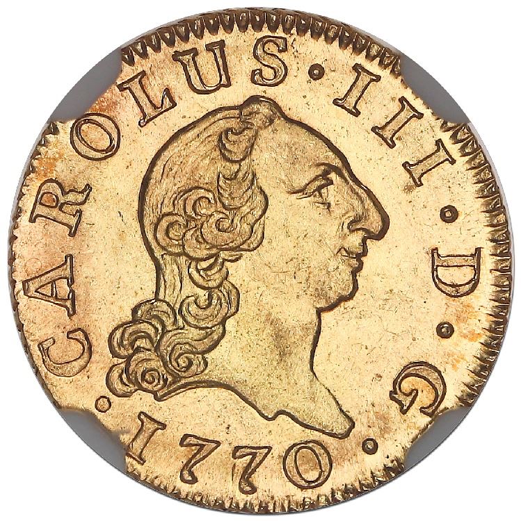Madrid, Spain, gold bust 1/2 escudo, Charles III (young bust), 1770PJ, NGC MS 64 ("top pop"). Cal-1254; KM-389.1. Superb strike and blazing luster, with only a couple light marks, tied with one other for finest in NGC census among just six entries (note NGC calls this type "bare bust" and Calico calls it "cara de rata"). NGC #2062508-001.