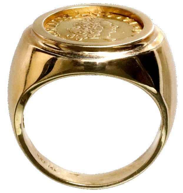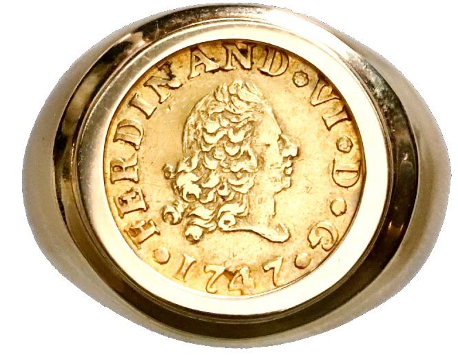 Madrid, Spain, gold bust 1/2 escudo, Ferdinand VI, 1747JB, mounted bust-side out in 14K gold ring (size 9-1/2). 10.21 grams total. Well-struck XF with both sides visible as prong-mounted inside bezel integrated into a thin-sided (unadorned) ring with peened interior. With photo-certificate.