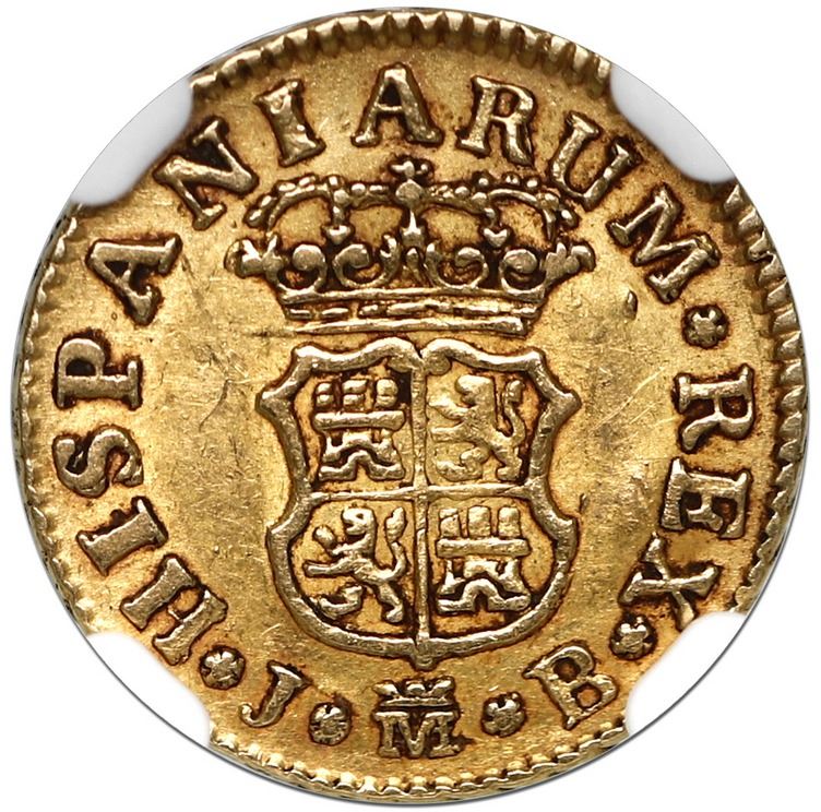 Madrid, Spain, gold bust 1/2 escudo, Ferdinand VI, 1754 JB, NGC AU 55. Cal-557; KM-378. Nice strike with smooth fields (but not lustrous), toned around details.