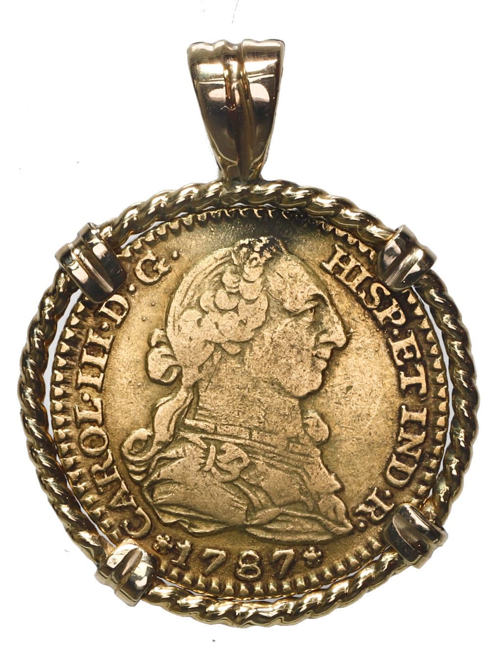 Madrid, Spain, gold bust 1 escudo, Charles III, 1787 DV, mounted in thin twisted-wire 18K gold bezel. 5.13 grams total. VF coin with toning around details, the twisted-wire effect in the gold bezel more eye-catching than the coin itself. With photo-certificate.