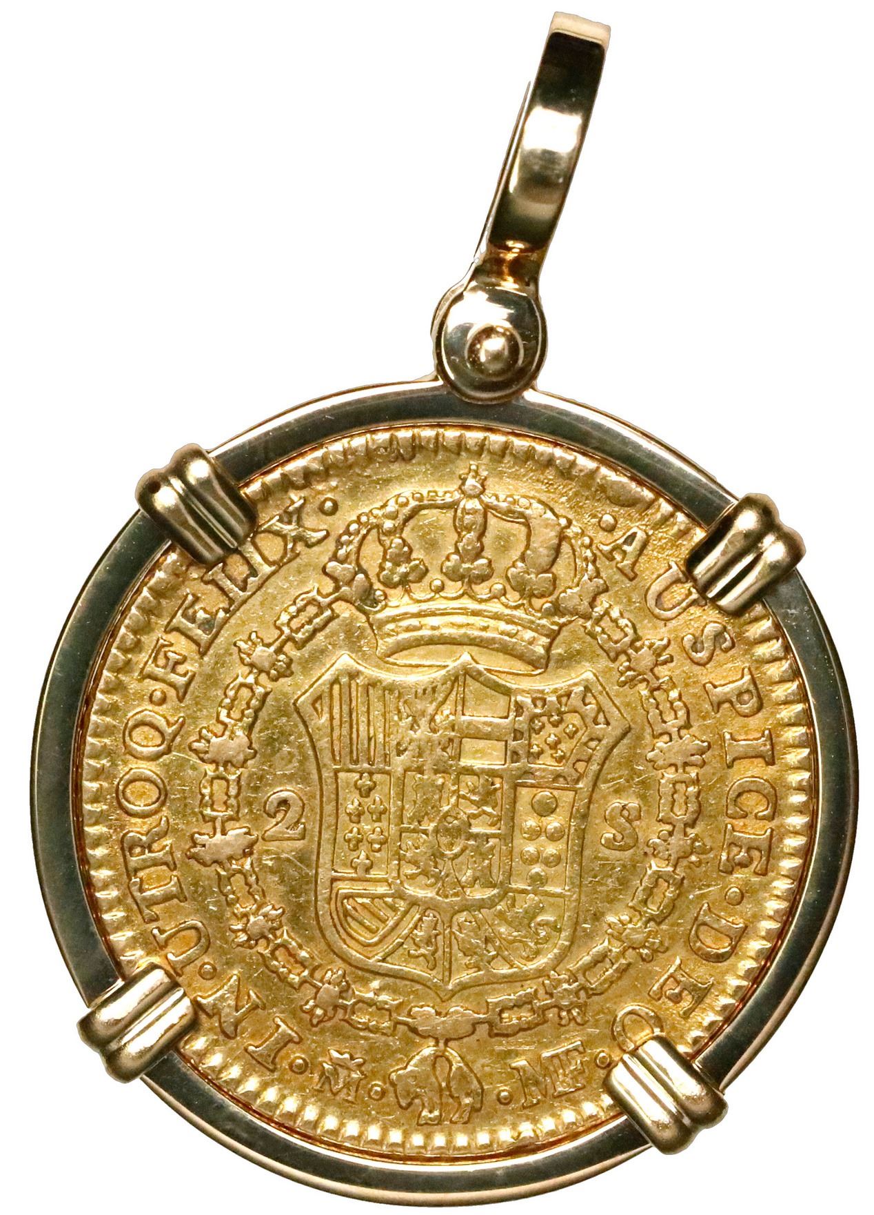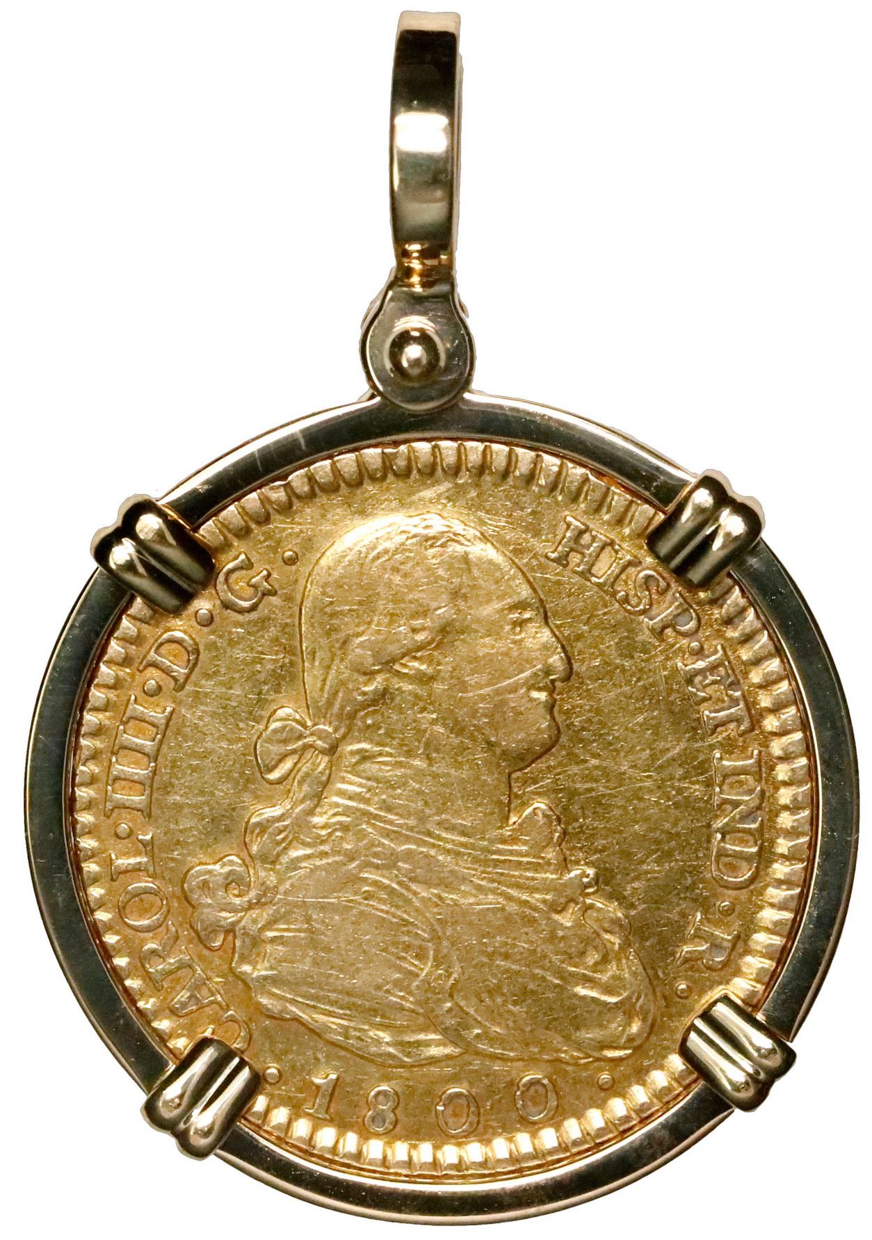 Madrid, Spain, gold bust 2 escudos, Charles IV, 1800 MF, mounted in 18K gold pendant with shackle bail. 10.99 grams total. Custom flat-edged bezel in high-karat gold around an XF coin with light scratches on bust, nicely medal-aligned to be worn with either side out.