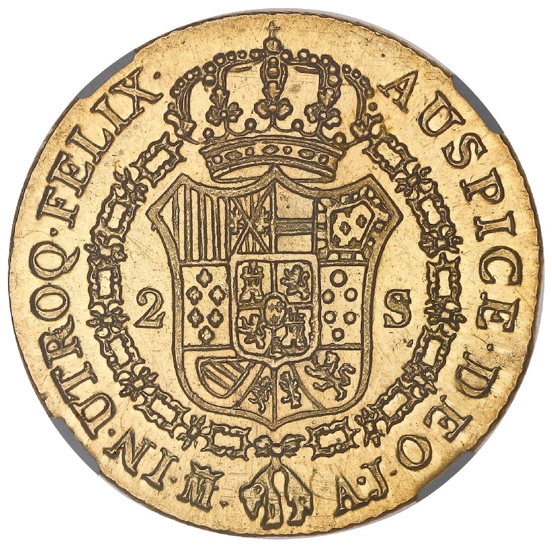 Madrid, Spain, gold bust 2 escudos, Ferdinand VII, 1825AJ, NGC AU 58. Cal-1631; KM-483.1. Brilliant luster, bright yellow gold, minimal rims despite the broad flan, light hairlines on obverse but no actual wear. NGC #4916882-002.